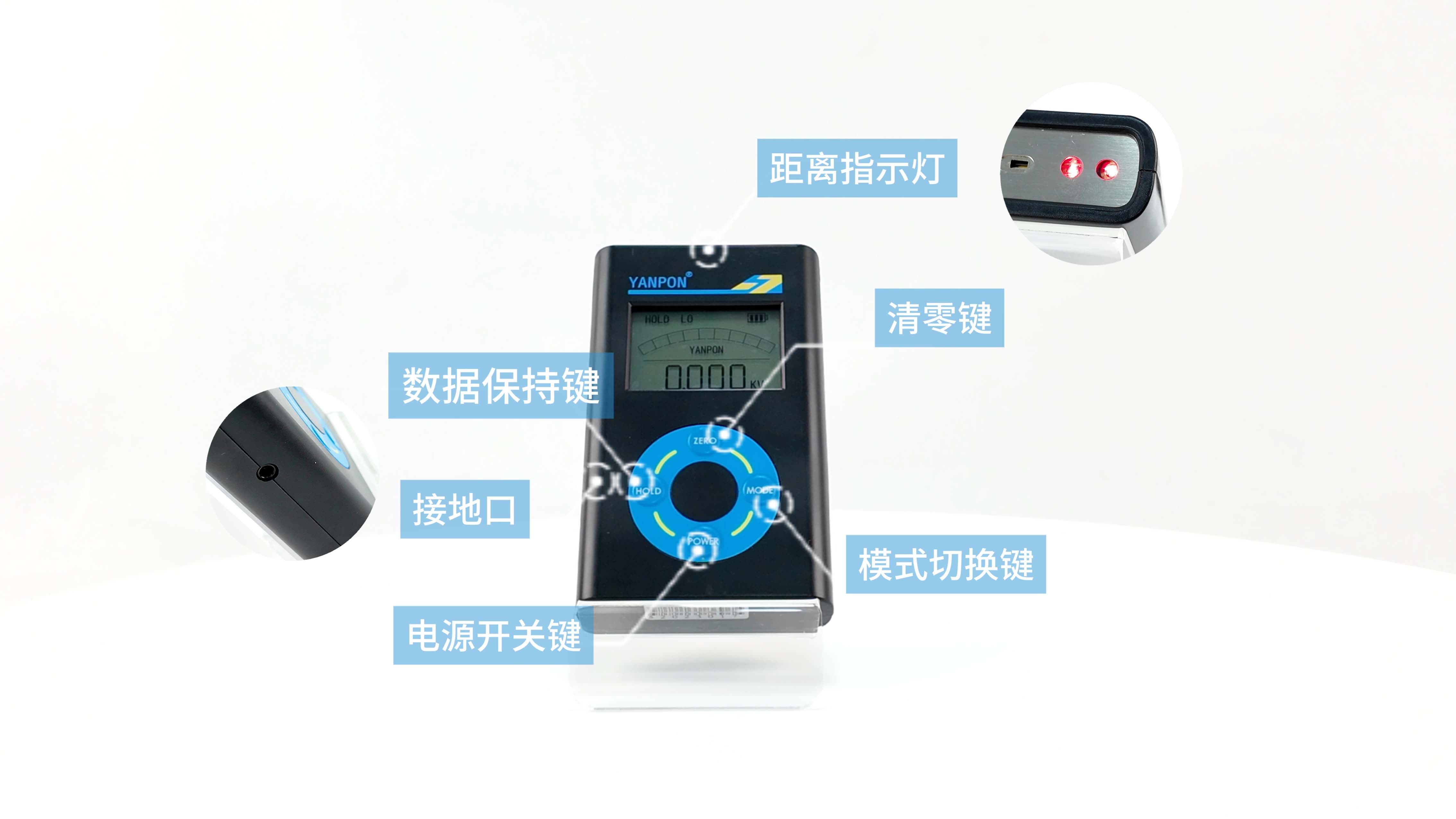 2 3量程可选 满足不同场景(Hl:高量程模式,量程为±30KV;LO:低量程模式,量程为土3KV;IB:离子平衡检测模式,量程为土100V)